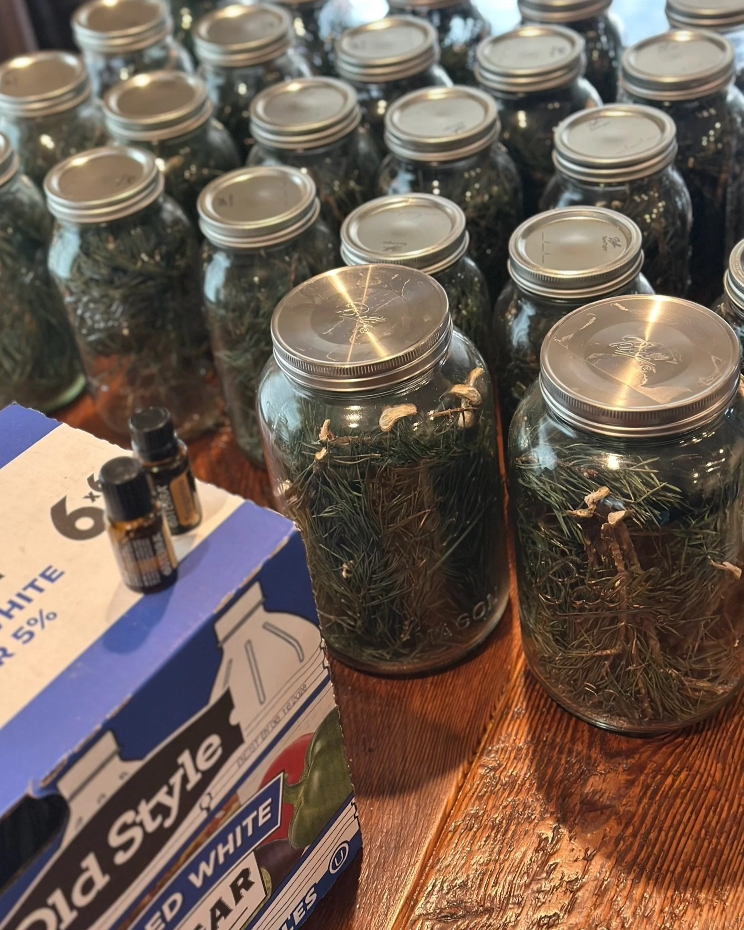 Pine needles contain natural antimicrobial compounds, including essential oils and plant phenols, that have historically been used for cleaning and purification. When pine needles sit in vinegar for several weeks, these compounds are slowly extracted into the liquid, strengthening the cleaning solution. There’s a reason pine has long been associated with “clean” - it’s part of pine’s identity.